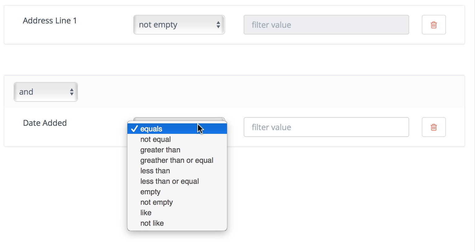 Once you have selected the field you can then choose the type of operation to perform. These vary depending on the way you wish to filter your contacts.